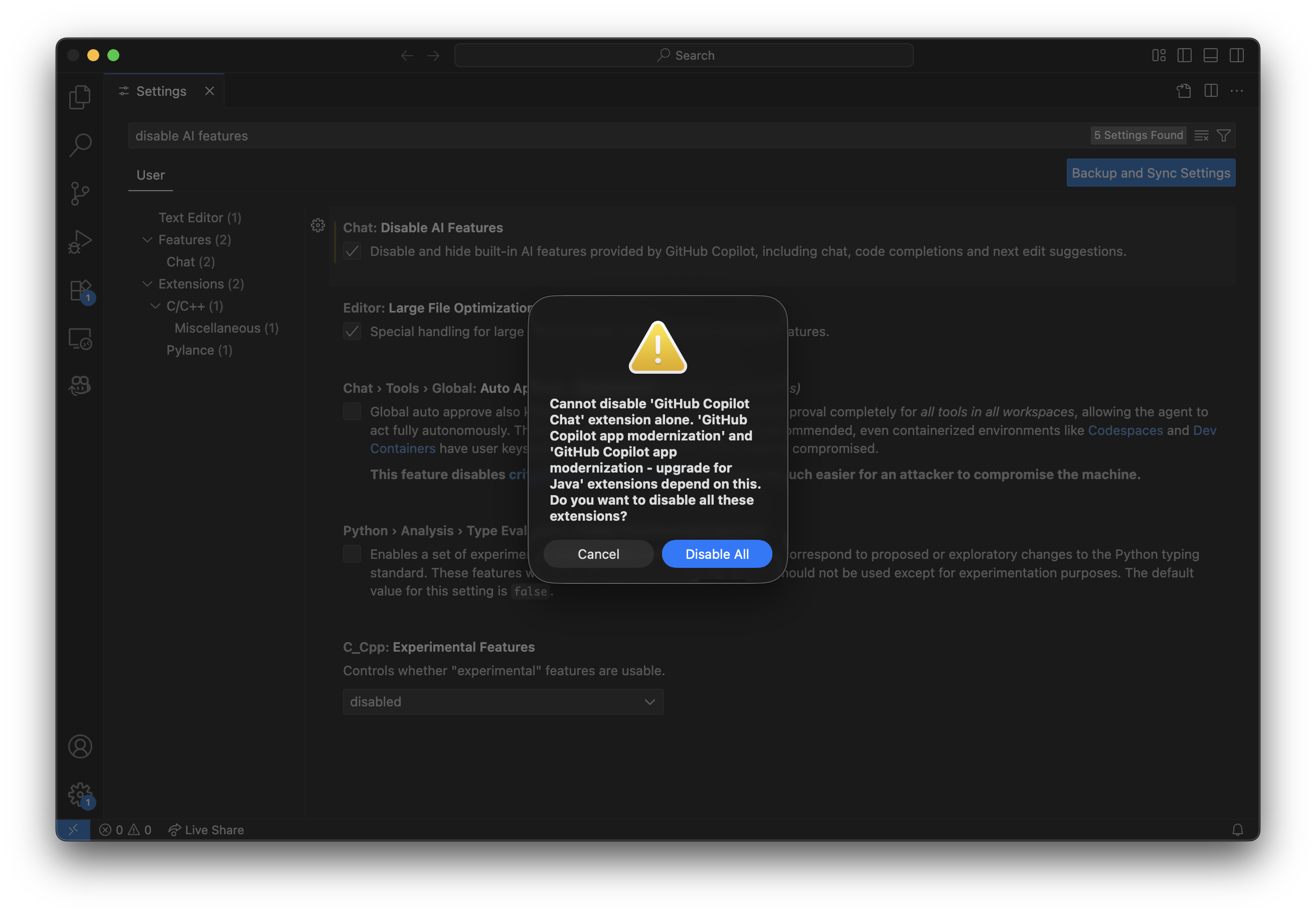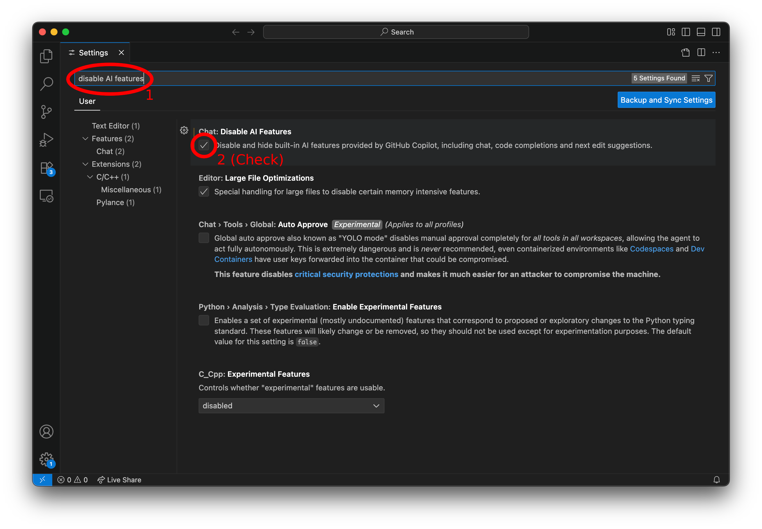 VS Code includes some AI-assisted coding tools (e.g. Copilot) by default. Disable these for your work in EECS 280 - using these tools for course projects is against the EECS 280 Generative AI Policy, and using AI as you’re learning to write code prevents you from developing your own foundational programming skills.